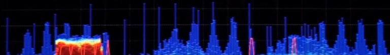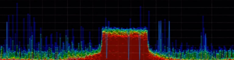 Bunun etrafında, şimdi bir FHSS kontrol sinyaline sahip olursunuz. FHSS’nin çalışma şekli, tüm bant boyunca atlayan sabit veri paketlerine sahip olmanızdır. Bu alttaki resim, bunun bir spektrum temsilidir ve mavi zirveler temelde taşıyıcının bulunduğu yerin tarihi konumlarıdır. Tt, o kadar yüksek bir frekansta atlıyor ki, genellikle görmek çok zor.