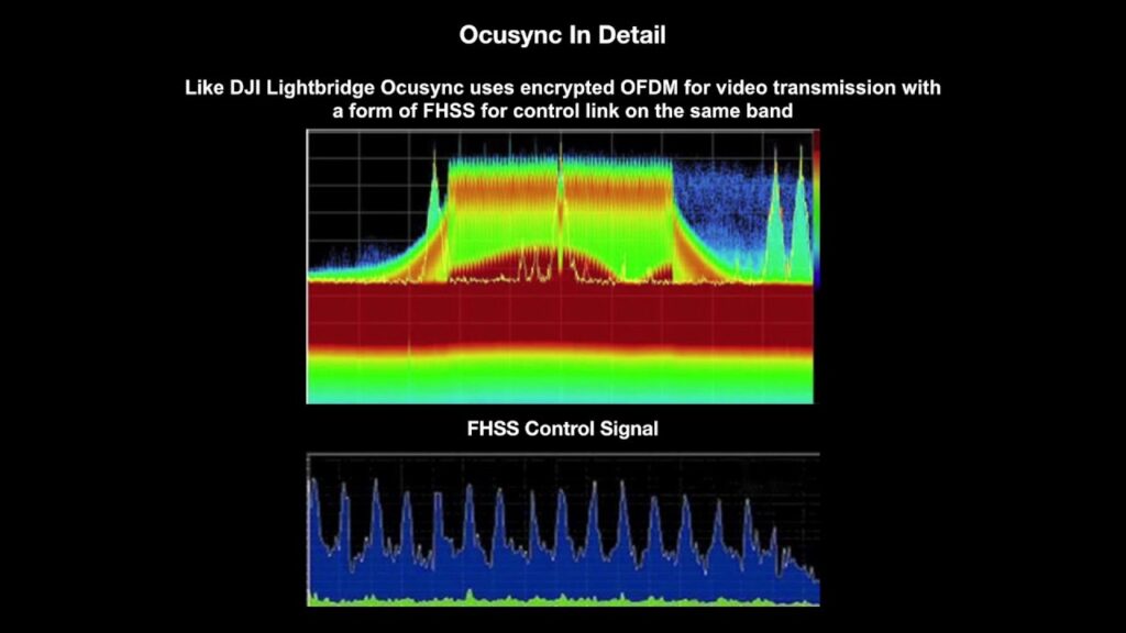 OcuSync’e çok daha detaylı bakıldığında, FHSS kontrol sinyalleri ile çevrili bir OFDM video taşıyıcısı olması anlamında temelde DJI Lightbridge ile aynı bir sistemdir. Üstteki resme bakarsanız, ortada bir OFDM taşıyıcınız var. Bu, ortada görebileceğiniz çok sayıda küçük taşıyıcıdan oluşan çok büyük kütledir. OFDM’nin bu drone üzerinde çalışma şekli, onu ilk açtığınızda net bir kanal arayacak ve video o kanala yerleşecek ve uçuş boyunca orada kalacaktır. Video taşıyıcının değişeceği tek zaman: